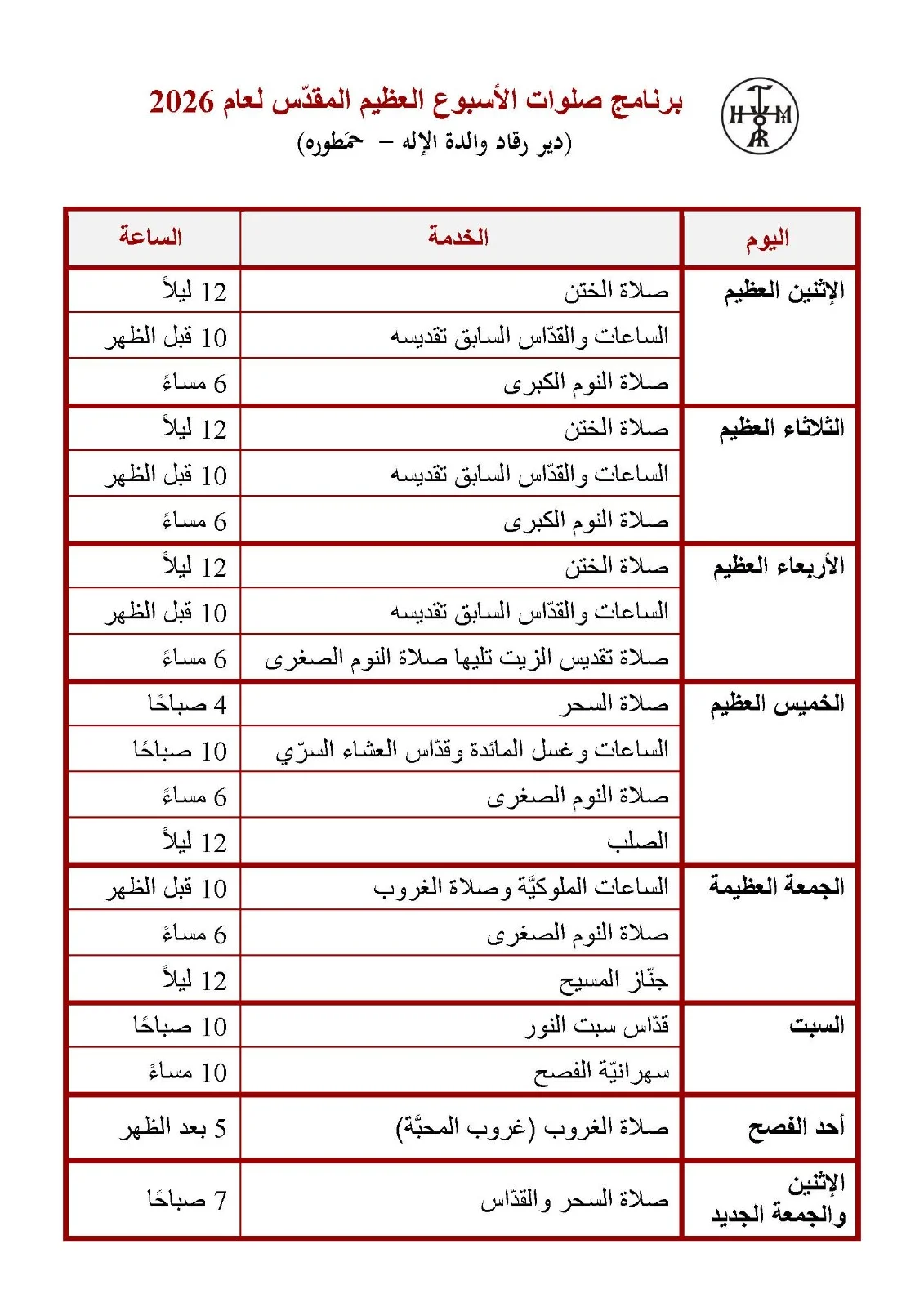 برنامج صلوات الأسبوع العظيم المقدّس في دير رقاد والدة الإله - حمَطوره